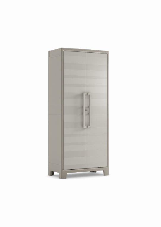 Skříň je vyrobena z odolného plastu, který chrání UV vrstva proti předčasnému stárnutí materiálu. Ochrana IPX3 zajistí bezpečné použití i ve vlhčím prostředí. Dveře jsou vybaveny systémem Assisted Opening System (AOS), který podporuje snadné a pevné zavírání. Stabilitu zajišťuje pátá noha a možnost uzamknutí skříně dodává na bezpečnosti.