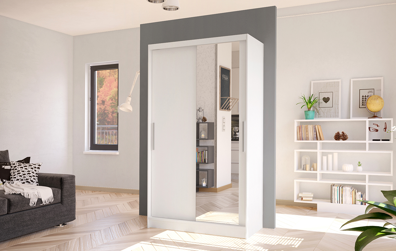 Dotaz na produkt Na splátky ještě dnesŠatní skříň Kosta VI v moderním designu má šířku 100 cm a je rozdělena na dvě praktické části. Posuvné dveře šetří místo a usnadňují přístup do interiéru. Vnitřní uspořádání kombinuje závěsnou tyč a čtyři police, což umožňuje přehledné a praktické rozdělení šatníku.