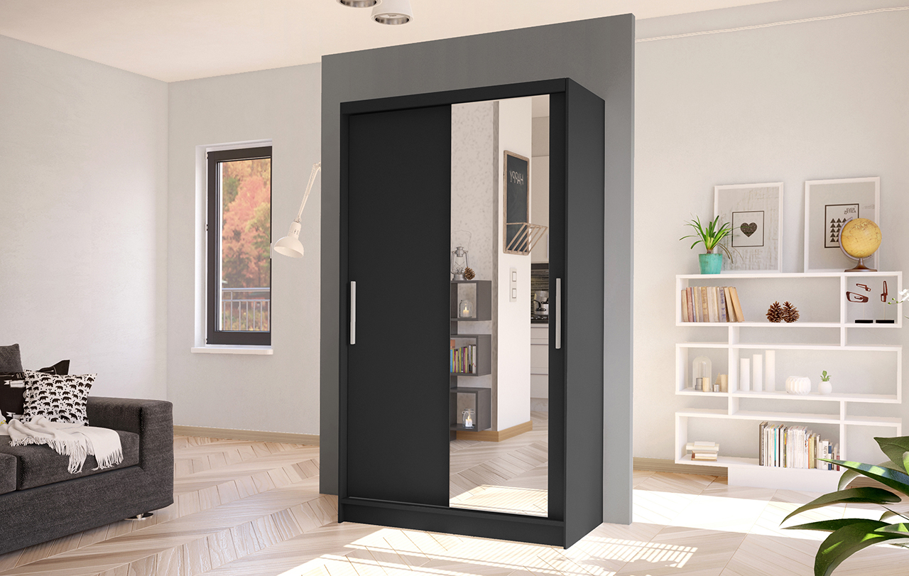 Dotaz na produkt Na splátky ještě dnesŠatní skříň Kosta VI v moderním designu má šířku 100 cm a je rozdělena na dvě praktické části. Posuvné dveře šetří místo a usnadňují přístup do interiéru. Vnitřní uspořádání kombinuje závěsnou tyč a čtyři police, což umožňuje přehledné a praktické rozdělení šatníku.