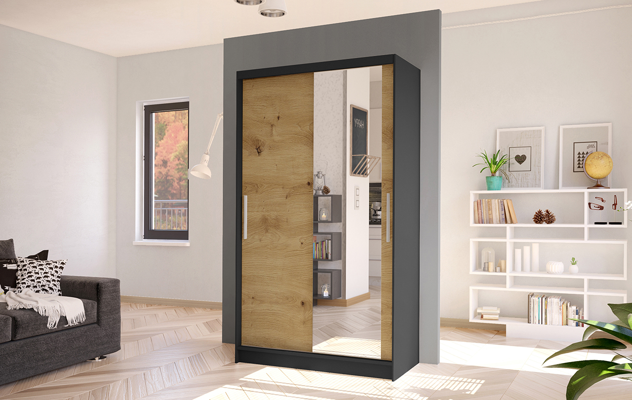 Dotaz na produkt Na splátky ještě dnesŠatní skříň Kosta VI v moderním designu má šířku 100 cm a je rozdělena na dvě praktické části. Posuvné dveře šetří místo a usnadňují přístup do interiéru. Vnitřní uspořádání kombinuje závěsnou tyč a čtyři police, což umožňuje přehledné a praktické rozdělení šatníku.