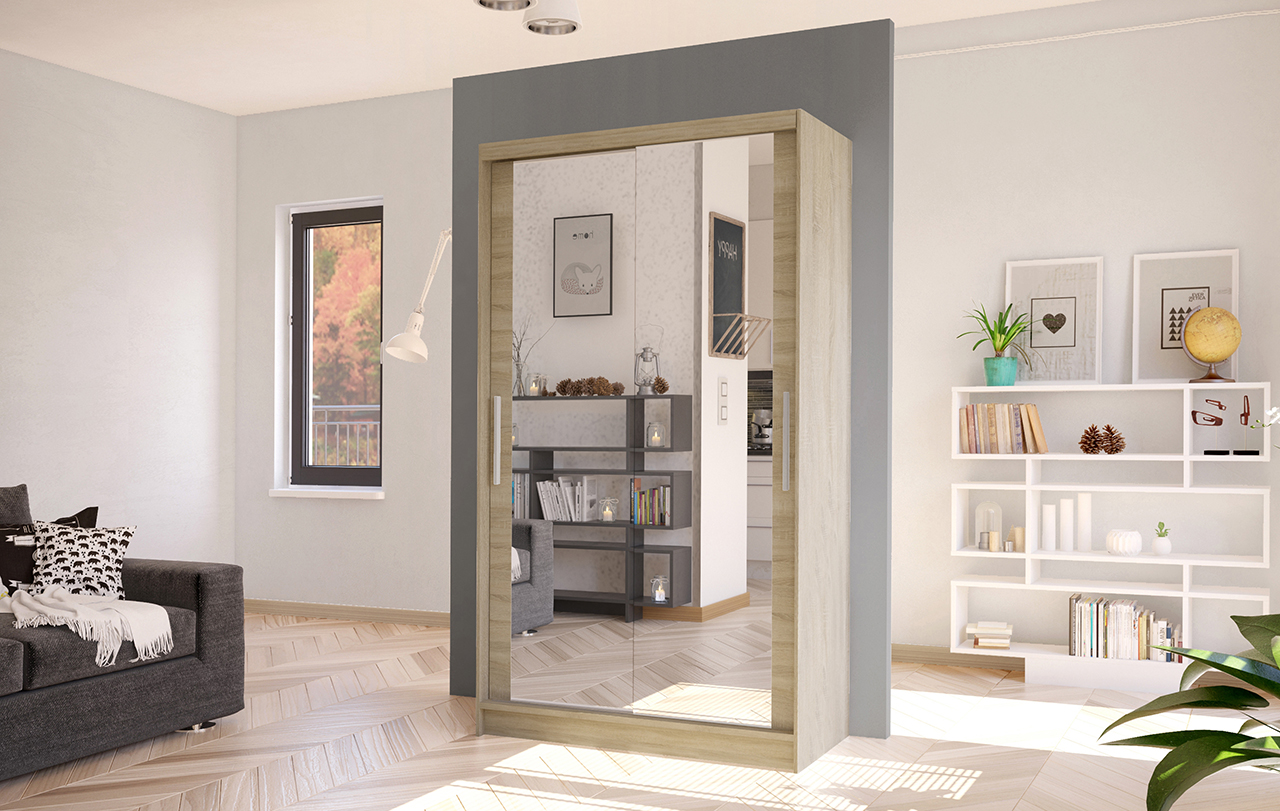 Dotaz na produkt Na splátky ještě dnesŠatní skříň Kosta VII v moderním designu má šířku 100 cm a je rozdělena na dvě praktické části. Posuvné dveře šetří místo a usnadňují přístup do interiéru. Vnitřní uspořádání kombinuje závěsnou tyč a čtyři police, což umožňuje přehledné a praktické rozdělení šatníku.