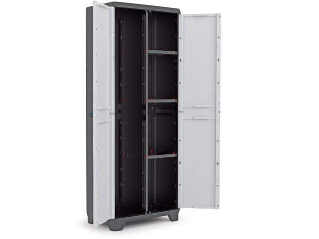 Dotaz na produkt Na splátky ještě dnesHledáte skříň do vašií koupelny, která vám dlouho vydrží a zároveň se do ní vejde spoustu věcí? Pak je zde pro vás plastová skříň KIS Lineár Utility v černošedé barvě. Tato skříň o rozměrech 68 x 173 x 39 centimetrů má dva úložné prostory. Na pravé straně je vybavena 3 variabilními policemi, jejichž nosnost je 10 kilogramů a na levé straně se nachází prostor na uložení vysokých předmětů jako jsou například košťata, mopy a podobně. Skříň se hodí do koupelny, protože má krásné linie a je navíc vybavená ergonomickými rukojeťmi v modré barvě. Můžete ji však použít i v dílně, garáži či úklidové místnosti. Její montáž je velice jednoduchá a zvládne ji opravdu každý již během 15-ti minut.