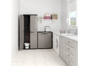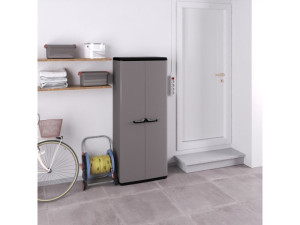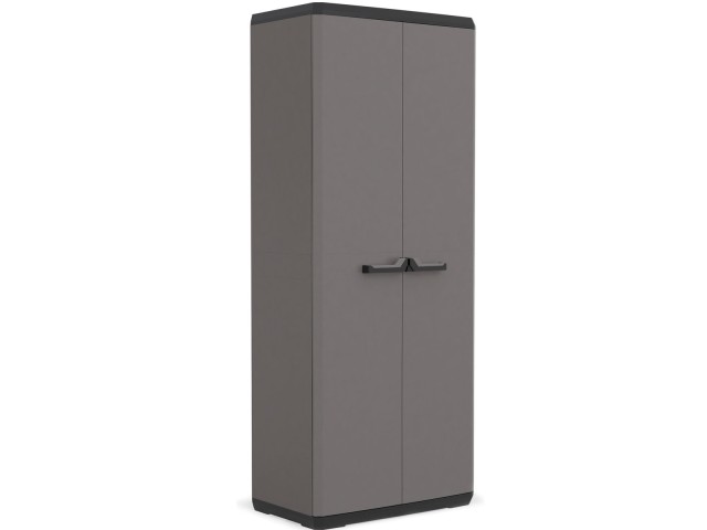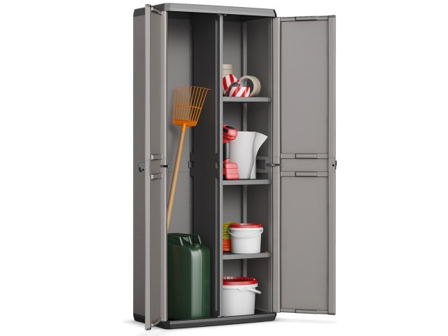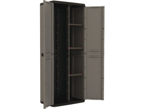 Úložná skříň PIU vysoká dělená, robustní konstrukce, jednoduchý design, vyrobena z kvalitního plastu odolného vůči přírodním vlivům a UV záření, ergonomické rukojeti, uzamykatelný systém (zámek není součástí balení), 3 nastavitelné police o nosnosti až 15 kg. Rozměry: 68 x 39 x 166 cm (š x h x v).