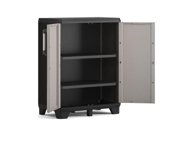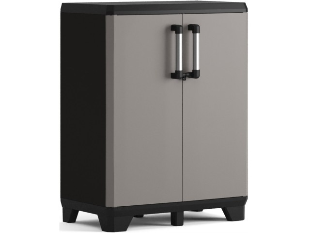 Úložná skříň PRO nízká je ideálním řešením pro organizaci Vašich věcí, vyrobena z odolného plastu, obsahuje 2 nastavitelné police s nosností až 20 kg, 4 rohové nožičky a zesílené dno díky dvěma extra středovým nožičkám, uzamykatelné dveře (zámek není součástí balení), elegantní hliníková madla, rozměry: 68 x 39 x 90 cm (š x h x v).