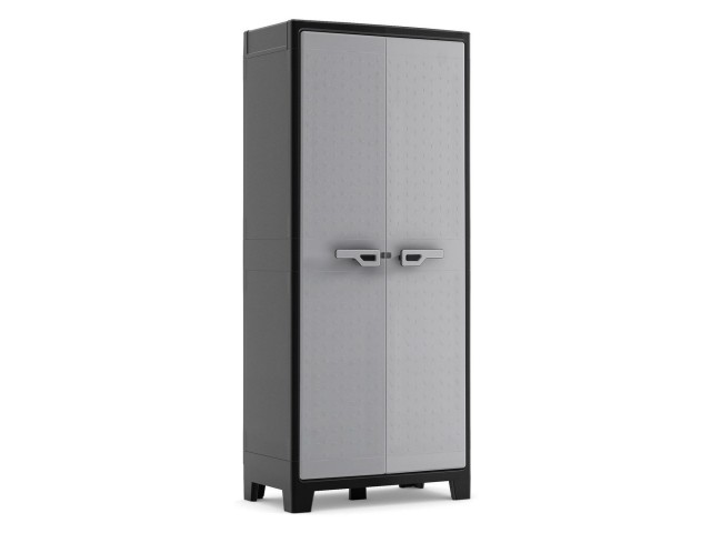 Velké rukojeti usnadní otevírání dveří a pro zvýšení bezpečnosti lze připevnit visací zámek. Skříň je vyrobena z odolného plastu a má černo-šedou barvu. Ve spodní části jsou nastavitelné nožky.