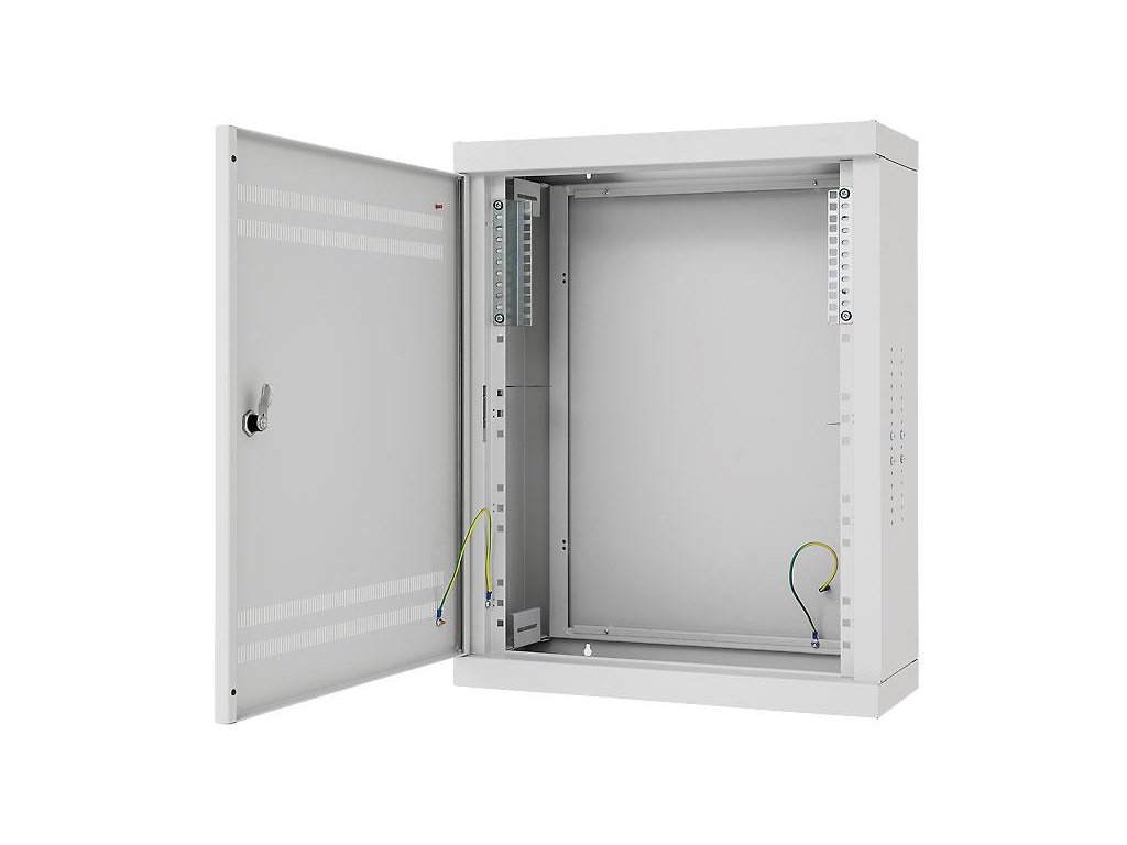 V horní polovině skříně najdete posuvné držáky, které osadíte 19” patch panely nebo jističovou vanou (svislá montáž). Na bocích v dolní polovině jsou držáky pro 19” zařízení, ty využijete při vodorovné montáži. Kabelové vstupy s vylamovacími záslepkami jsou umístěné na stropě a dně skříně. Na spodní části se nachází šroub M8 pro připojení pospojení.