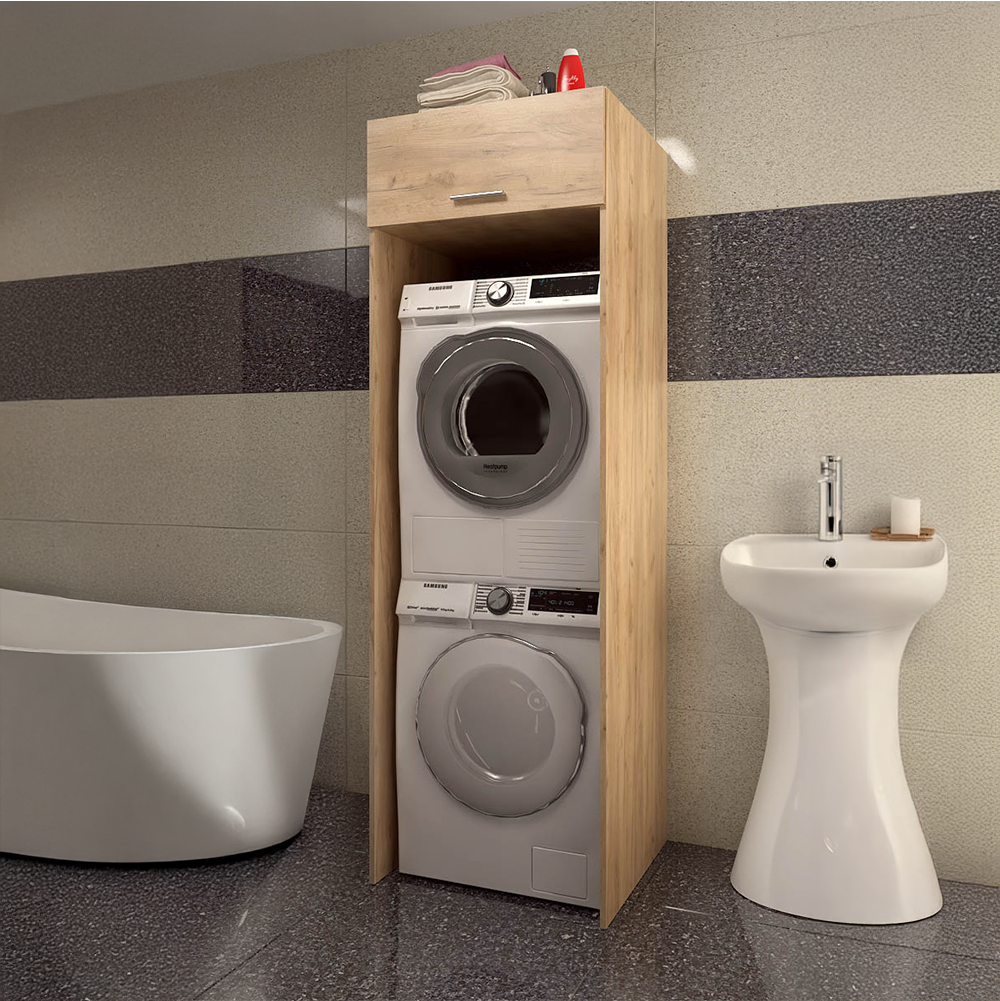Materiál: laminovaná DTD • Barva: dub artisan • Rozměry (ŠxHxV): 67,5x67x210 cm • Prostor pro pračku a sušičku (ŠxHxV): 64x65x180 cm • Tloušťka materiálu: 1,6 cm • Otevřený úložný prostor • Výklopná...