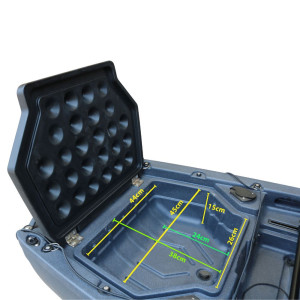 Díky chytré dvoudílné konstrukci ho snadno hodíte do zavazadlového prostoru auta i do sklepa. Sedadlo je pohodlné jak nedělní křeslo a navíc se dá složit nebo úplně sundat - podle toho, jestli chcete pohodlí nebo extra místo pro výbavu. Úložných vodotěsných prostorů je tu hned několik - přední, zadní i dva boxy uprostřed, takže se vám do něj vejde od svačiny až po správnou vodáckou výbavu nebo živé rybičky. Díky UV ochraně si slunce může svítit, jak chce - materiál vydrží a nepopraská.