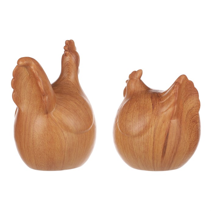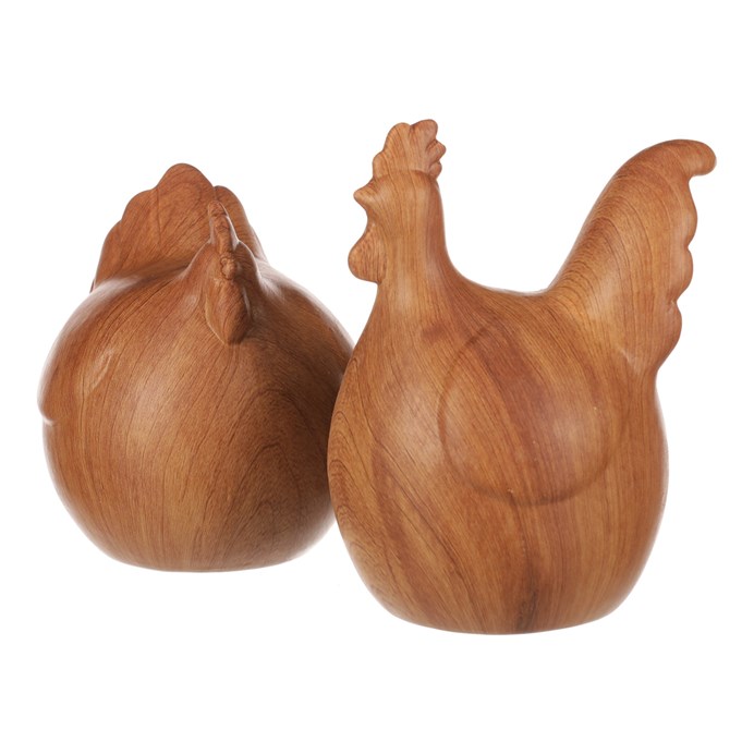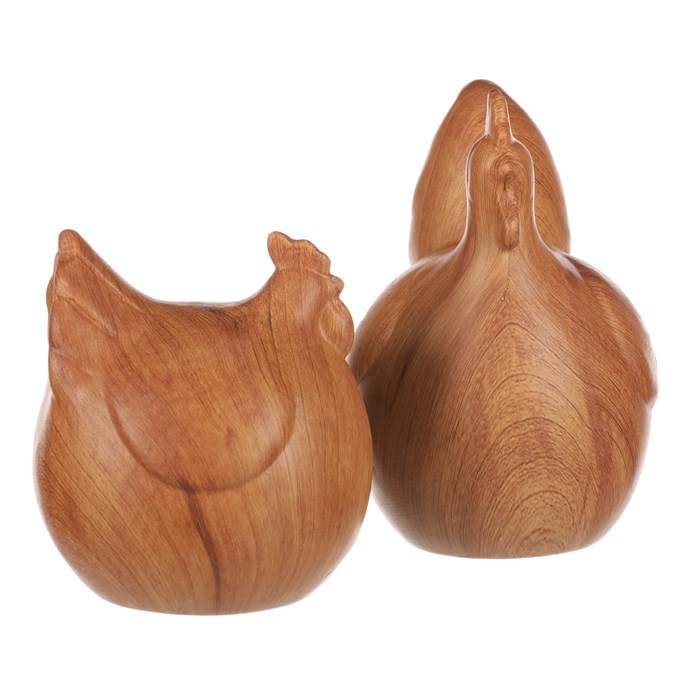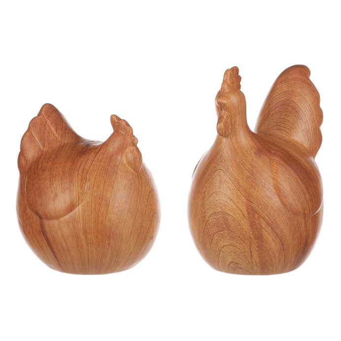 Dotaz na produktKeramické figurky kohouta a slepičky v dřevěném stylu jsou krásným doplňkem velikonoční výzdoby. Jejich zpodobnění je jednoduché, bez detailů, což z nich činí univerzální a vysoce elegantní ozdobný prvek. Nádherná barva dřeva s letokruhy umocňuje jedinečnost a půvab těchto neživých opeřenců. Skvěle se hodí do chalup, nebo chat, kde je interiér laděný do přírodního designu. Na druhou stranu, v moderním prostředí budou úžasně kontrastovat a vynikne v něm jejich silueta a půvab imitovaného dřeva. V jednoduchosti je krása, a u těchto figurek to platí obzvláště. Vaše jarní výzdoba díky nim získá nový, svěží vzhled jednoduše a hravě.