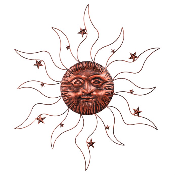 Dotaz na produktTato nástěnná kovová dekorace v měděné barvě představuje slunce s paprsky a hvězdami na jejich bocích. Paprsky a hvězdičky jsou nádherně pravidelné a střídají se vždy ve stejném pořadí, vytvářejíce harmonickou a symetrickou ozdobu. Tato dekorace bude skvělým přídavkem zejména na venkovní zdi, a díky svým dostatečně velkým rozměrům bude dominantním prvkem, který upoutá pozornost všech kolemjdoucích. Pro ty, kteří mají rádi astronomii a obdivují nebeské úkazy, bude tato dekorace obzvlášť působivá.