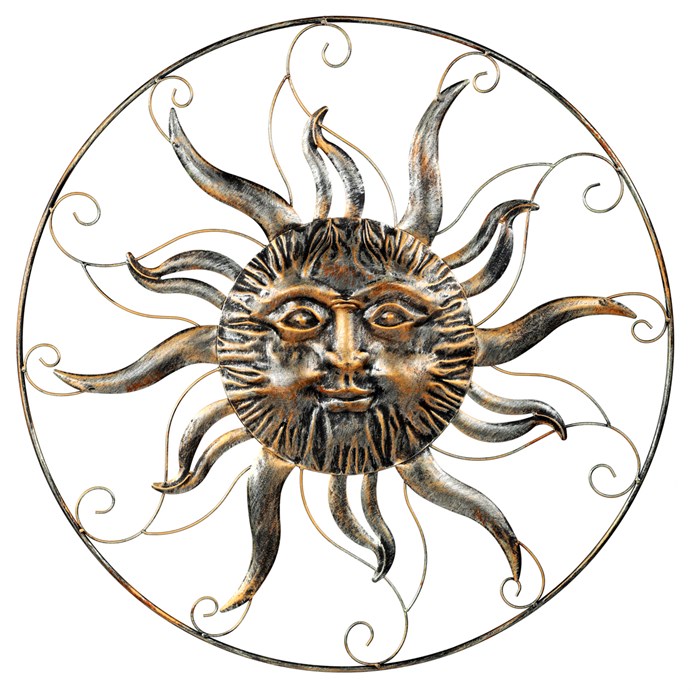 Dotaz na produkt Na splátky ještě dnesTato unikátní kovová nástěnná dekorace představuje slunce v barvě přípomínající mosaz. Je elegantně vsazeno do kruhu a má tři různé druhy paprsků, které se vzájemně střídají ve stejném pořadí. V jeho středu je vyobrazen obličej, což mu dodává na živosti. Nejtenčími a zároveň nejdelšími paprsky je spojeno s vnějším kruhovým rámem. Tato nádherná závěsná dekorace dodá krásu zejména venkovním prostorům. Pokud však najdete vhodné místo, může zdobit i interiér. Celá konstrukce představuje dokonalý harmonický celek, který bude na zdi skutečně vynikat. Vaši návštěvníci, případně kolemjdoucí, budou v úžasu při pohledu na tento dekorační skvost.