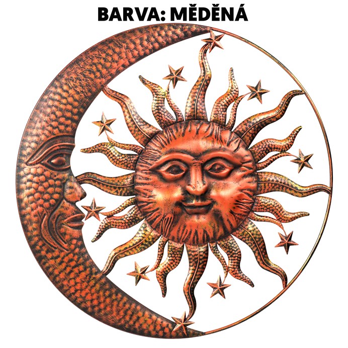 Dotaz na produkt Na splátky ještě dnesKovová nástěnná dekorace představuje slunce a měsíc v měděném odstínu, který dodává teplý a přirozený vizuální efekt. Jemně tvarované detaily slunečních paprsků a měsíčního obličeje vytvářejí zajímavý kontrast a působivý designový prvek. Dekorace je vybavena praktickým otvorem pro snadné zavěšení na zeď, což umožňuje její snadné umístění v interiéru. Je vhodná pro oživení stěn v obývacích pokojích, chodbách nebo na terasách s krytým prostorem.