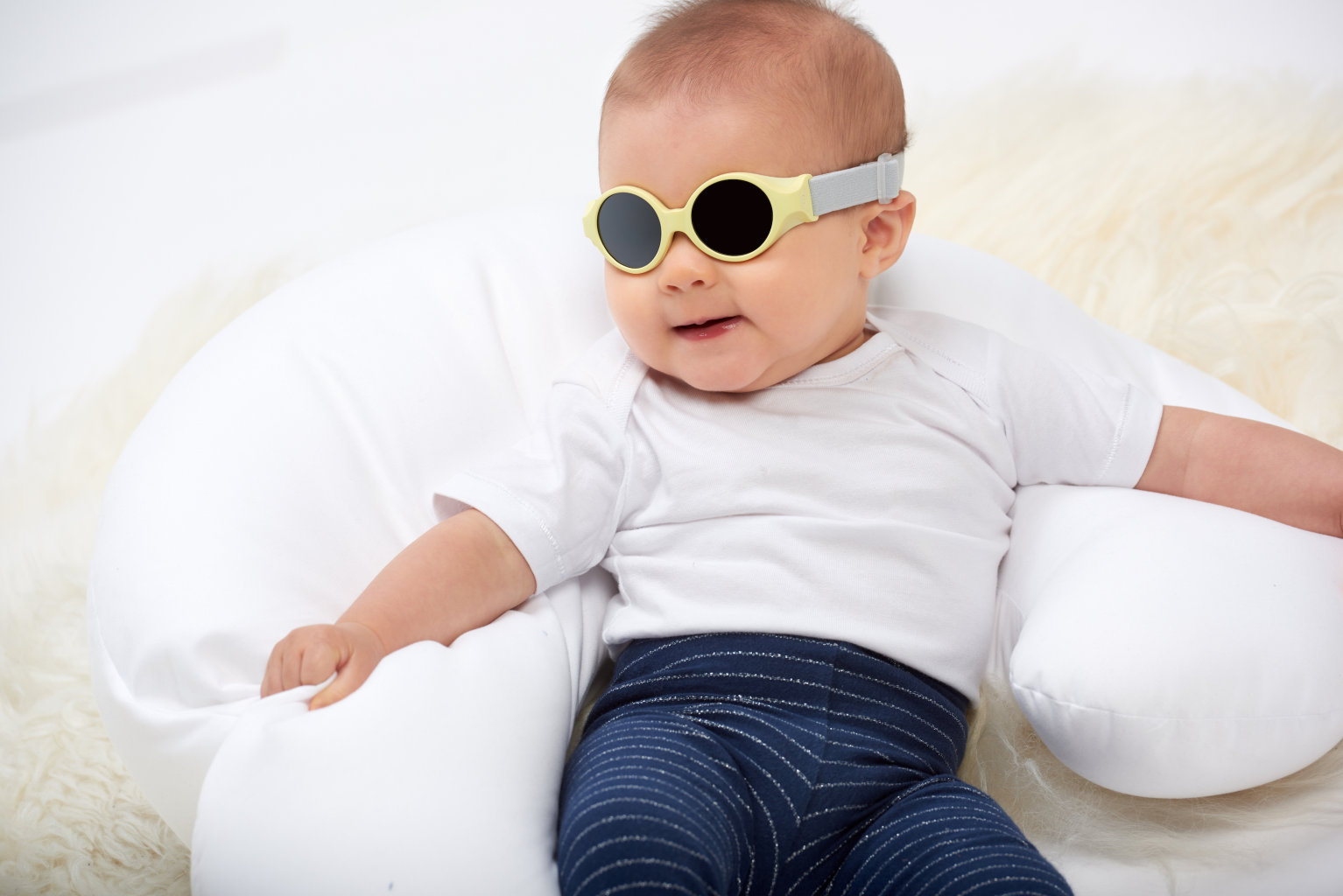 Nastavitelný gumový pásek kolem hlavy brýle bezpečně udrží na hlavičce dítěte vleže i ve vzpřímené poloze. Obroučky jsou vyrobeny z měkkého, pohodlného materiálu, který se přizpůsobí obličeji dítěte. Jejich tvar chrání oči dítěte i proti pronikání slunečního záření ze strany.