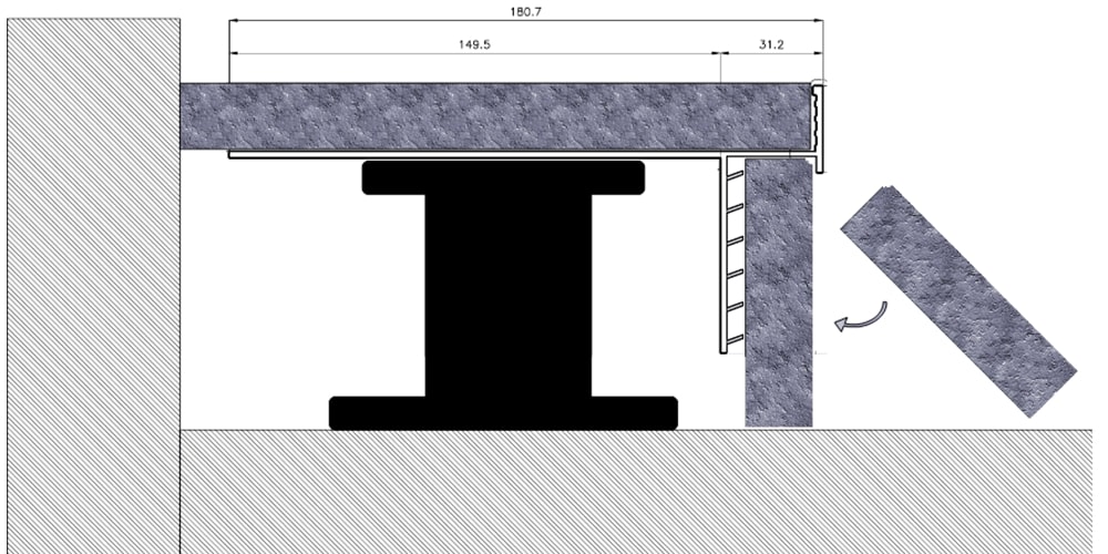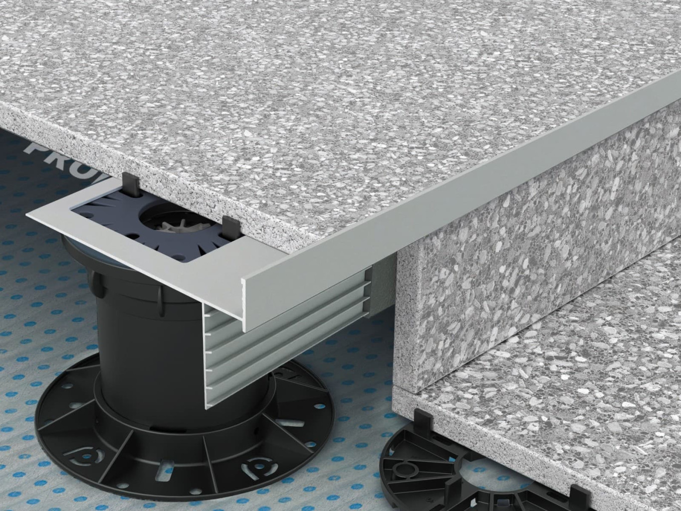 Soklová lišta Prosupport profile T – šedý, eloxovaný hliník – je univerzální pro různé typy teleskopických terčů pod 2cm dlažbu a umožnuje zakončení instalované dlažby nalepením soklového prvku, nařezaného z dané dlažby. Lišta se volně pokládá na terče, následně se zatíží dlažbou, na lištu i na sokl se nanese cementové lepidlo a sokl se poté nalepí. Soklová lišta Prosupport profile T zakrývá pohledovou hranu dlažby vodorovně uložené na terčích.