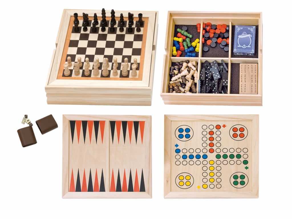 VELKÝ SOUBOR HER WOODY  nabízí 8 her - šachy, dáma, člověče nezlob se, vrhcáby, backgammon, mlýn, kameny pro domino a karty.