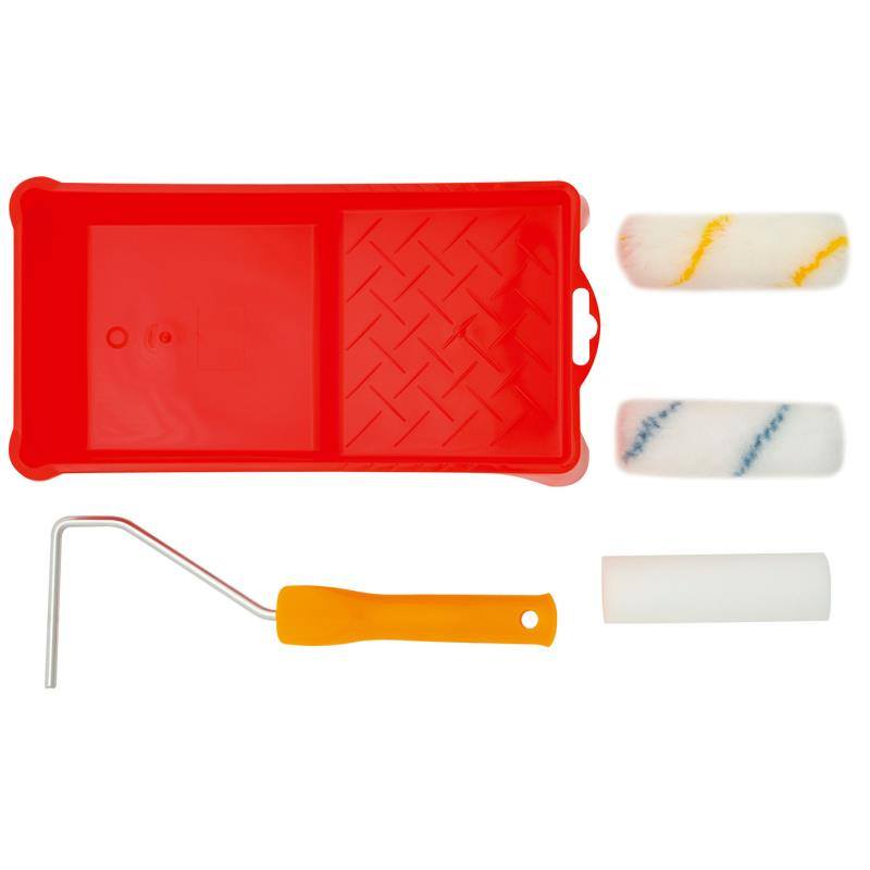 souprava lakovací - sada 5 kssada obsahuje: miska pro lakovací válečky, držák válečku, 3 ks válečkůnejvhodnější pro barvy: klihové, disperzní, mořidla, lazury, vodou ředitelné laky
