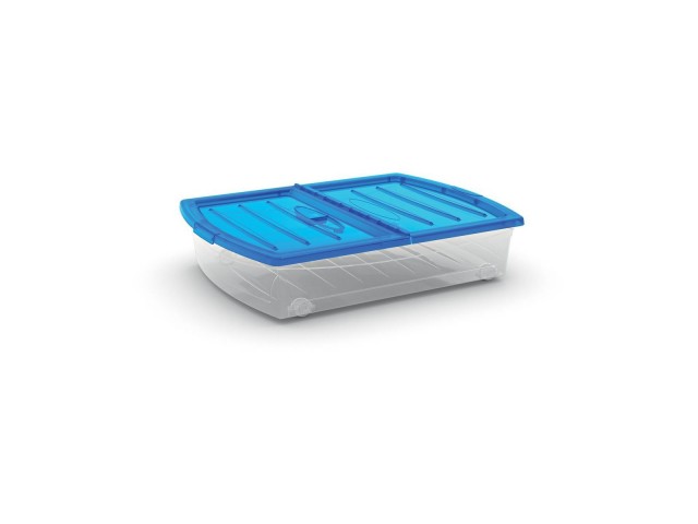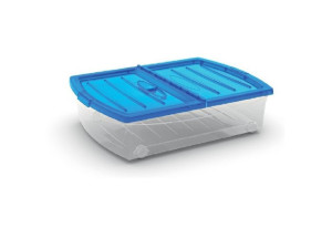 Průhledný úložný Spinning Box velikosti XL disponuje objemem 56 litrů. Díky nízké výšce je ideální pod postel na uložení oblečení či ložního prádla. Lze ho uzavřít modrým duálním víkem s aroma přihrádkou. Navíc je vybavený zabudovanými kolečky pro snadný přesun.