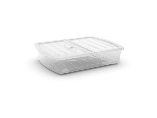 Průhledný úložný Spinning Box velikosti XL disponuje objemem 56 litrů. Díky nízké výšce je ideální pod postel na uložení oblečení či ložního prádla. Lze ho uzavřít duálním víkem s aroma přihrádkou. Navíc je vybavený zabudovanými kolečky pro snadný přesun.