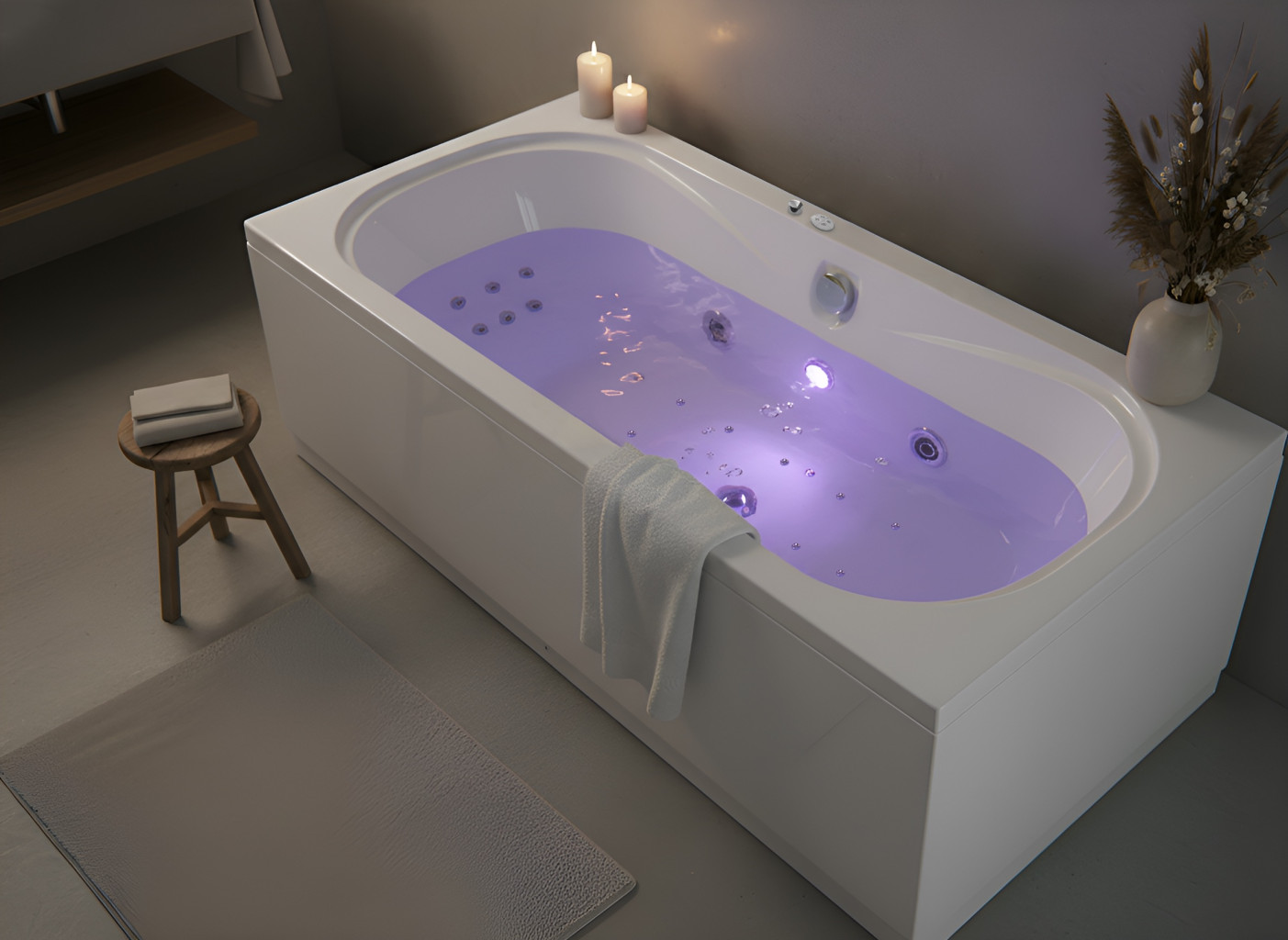 Výhodou této hydromasážní vany s chromoterapií je možnost přidání bylinných či relaxačních extraktů.