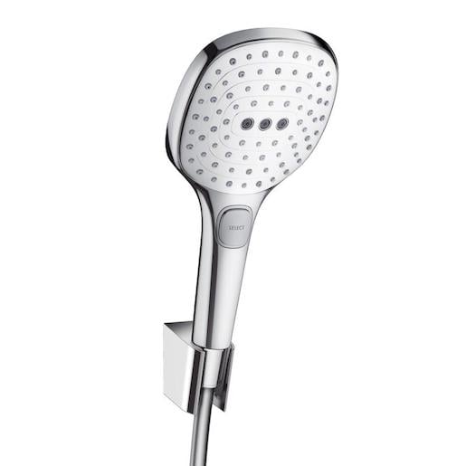 Sada se sprchovým držákemRaindance Select E 120 3jet 1,60 mod společnosti hansgrohe se skládá ze sprchové hlavice, sprchového držáku a sprchové hadice. Zde je vše pro velké potěšení ze sprchování: Ruční sprcha Vás rozmazluje třemi různými druhy proudů: Díky proudu RainAir se voda vydatně obohacuje vzduchem. To vytváří nádherně jemné a objemné kapky pro relaxační dešťovou sprchu. Naproti tomu silný typ proudu Rain oživuje a je ideální pro ranní probuzení nebo pro opláchnutí šamponu. Se třemi rotujícími vodními tryskami pomáhá masážní proud Whirl cíleně uvolňovat napnuté svaly.