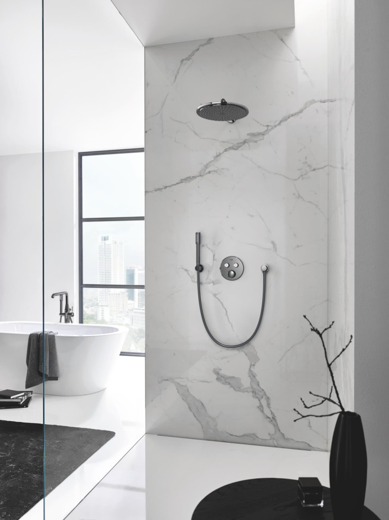 Dotaz na produkt Na splátky ještě dnesPodomítková termostatická baterie Grohtherm SmartControl v provedení Hard Graphite zajistí, že každá sprcha nebo koupel, do které vstoupíte, vás nezklame. Poskytuje precizní ovládání pro sprchu i vanu, zatímco její minimalistický design dovede každou moderní koupelnu k dokonalosti. Inovativní technologie SmartControl vám umožní přepínat mezi požadovanými zdroji proudu a regulovat objem vody a její teplotu pomocí otočných tlačítek. Dva ventily znamenají, že můžete snadno přepínat, nebo kombinovat, hlavovou a ruční sprchu, případě sprchu a vanovou výpusť. Technologie GROHE TurboStat zabraňuje nepříjemným teplotním výkyvům. Značení GROHE EasyLogic a vroubkovaná tlačítka s vyměnitelnými symboly činí ovládání mimořádně snadným. Bezpečnostní pojistka GROHE SafeStop zabraňuje nastavení teploty vyšší než 38 °C, aby nebylo možné se popálit, zatímco volitelná pojistka GROHE SafeStop Plus dále zabraňuje nastavení vyšší teploty než 43 °C, což je přidaná úroveň zabezpečení. Baterie je tak dokonale vhodná do rodinných koupelen. Úsporná technologie GROHE EcoJoy vám nabídne snížený průtok vody bez jakéhokoliv kompromisu ve výkonu a požitku. Systém GROHE QuickFix zajišťuje jednoznačnou a bezproblémovou montáž. Štíhlá konstrukce zásadně usnadňuje čistění baterie, zatímco odolný povrch GROHE StarLight zajišťuje dokonalý vzhled po celou dlouhou dobu životnosti. Tato baterie jednoznačně pozvedne úroveň vaší koupelny, a to nejen díky svému minimalistickému designu plného elegantně zaoblených tvarů. Tuto baterii je možné zapojit pouze v kombinaci s podomítkovým tělesem GROHE Rapido SmartBox (35600000).