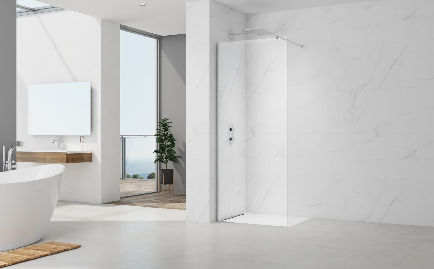 Sprchová zástěna z transparentního bezpečnostního skla (6 mm) zabraňuje rozstřikování vody po celé koupelně, ale zároveň přináší volnost při vstupu do sprchy bez nutnosti otevírání dveří a překračování prahu. Průhledné sklo dává příležitost vyniknout sprchové baterii či obkladům ve sprše. Šířka vstupu a tím pádem i celé sprchy lze přizpůsobit individuálním požadavkům díky nastavitelné šířce zavětrování (max 120 cm).