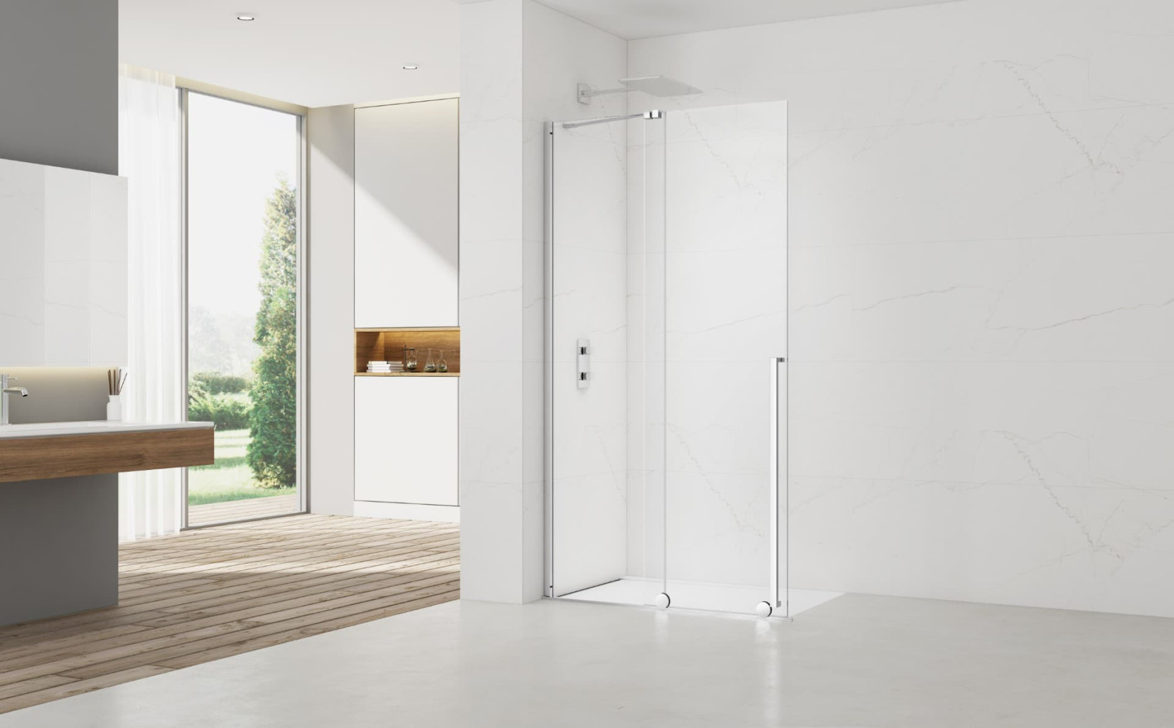 Balíček výrobce SAT ze série Xmotion je perfektní volbou pro každého, kdo hledá pro sprchování širokou zástěnu, kterou může po osvěžení zmenšit až téměř na polovinu svojí šířky, aby zvětšil prostor v koupelně. Designová a spolehlivá kolečka jezdí na dlažbě či sprchové vaničce v kolejničce podle potřeby, aby otevření či zavření dveří bylo co nejsnazší a nejplynulejší. Jednoduchosti ovládání dveří pomáhá i masivní madlo, které na transparentním skle skvěle vyjímá. Průhledné sklo a bezrámové zpracování navíc dává prostor vyniknout obkladům či samotné sprše ve sprchovém koutu.