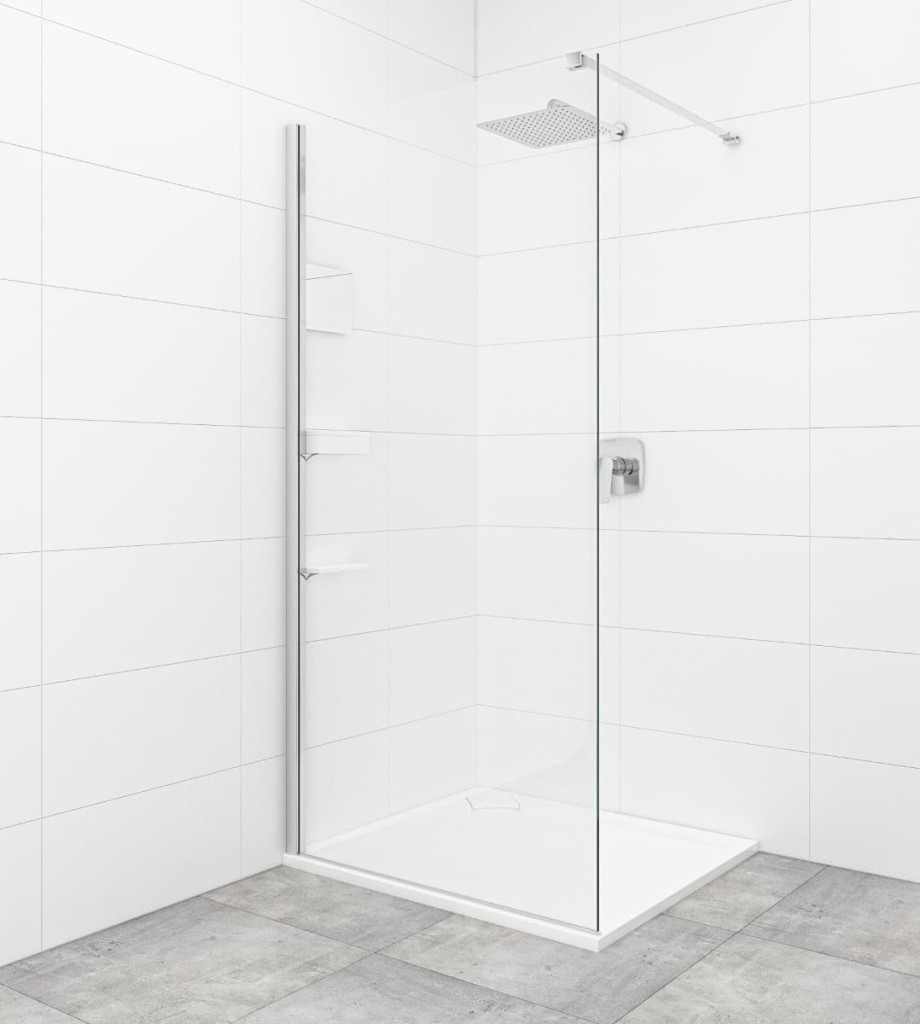 Sprchové kouty typu walk-in nabízí trendy a jednoduché řešení nejen do malých koupelen, kde získáte pocit otevřeného a vzdušnějšího prostoru. Sprchová zástěna z transparentního bezpečnostního skla zabraňuje rozstřikování vody po celé koupelně, ale zároveň přináší volnost při vstupu do sprchy bez nutnosti otevírání dveří a překračování prahu. Průhledné sklo dává příležitost vyniknout sprchové baterii či obkladům ve sprše. Šířka vstupu a tím pádem i celé sprchy lze přizpůsobit individuálním požadavkům díky nastavitelné šířce zavětrování (max 120 cm).