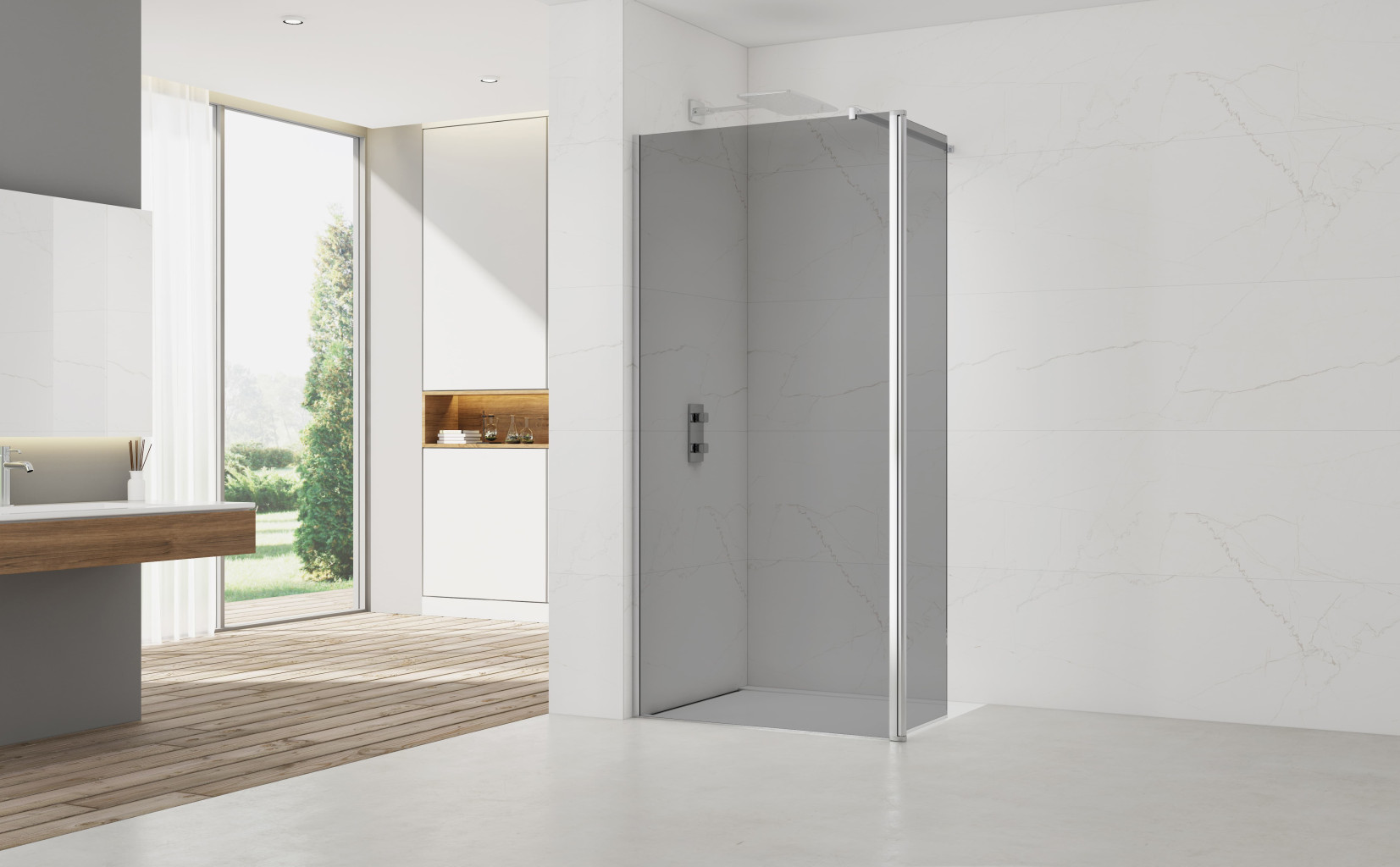 Tato zástěna je ideální volbou díky neprůhlednému sklu s kouřovým efektem. Profily jsou v lesklém chromu, které jsou z hliníku. Součástí zástěny jsou profily, otočná stěna a zavětrování, tedy není potřeba již nic dalšího dokupovat. Sprchovou zástěnu lze instalovat na sprchovou vaničku i na dlažbu v kombinaci se sprchovým žlabem. Sklo je opatřeno povrchovou úpravou Easy Clean - usnadňuje čištění a zabraňuje usazování vodního kamene.