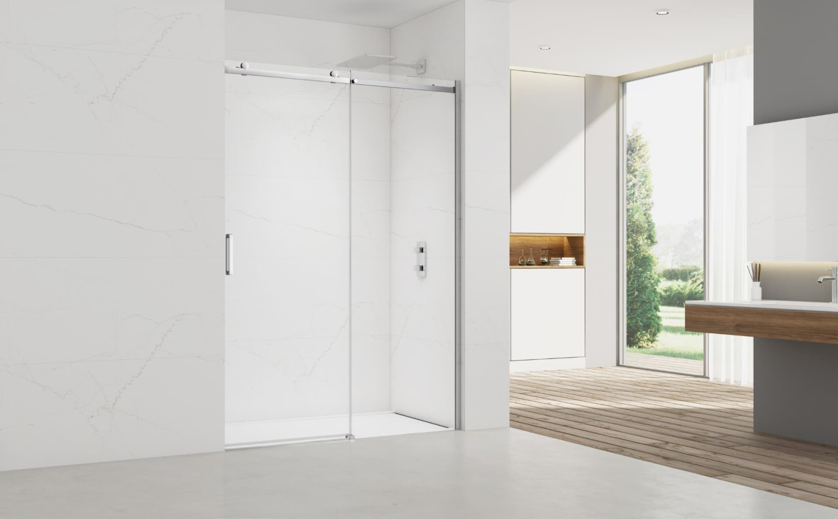 Sprchové dveře lze kombinovat s boční stěnou o rozměrech (120x80, 120x90 cm). Dveře jsou posuvné a mají technologii SOFT-CLOSE. Jedná se o zpomalovací mechanismus, který Vám sám otevře/dovře sprchové dveře a nehrozí náraz do boční stěny. Montáž lze provést přímo na podlahu, ale i na sprchovou vaničku. Na sklech je povrchová úprava Easyclean, která usnadňuje čištění a minimalizuje usazování vodního kamene.