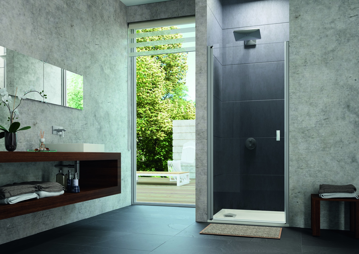 - Částečně orámované dveře s jedním skleněným křídlem, otevíraným dovnitř a ven. Při montáži s boční stěnou pro otevírání dovnitř je nutný doplňkový set pro otevírání dovnitř a ven.