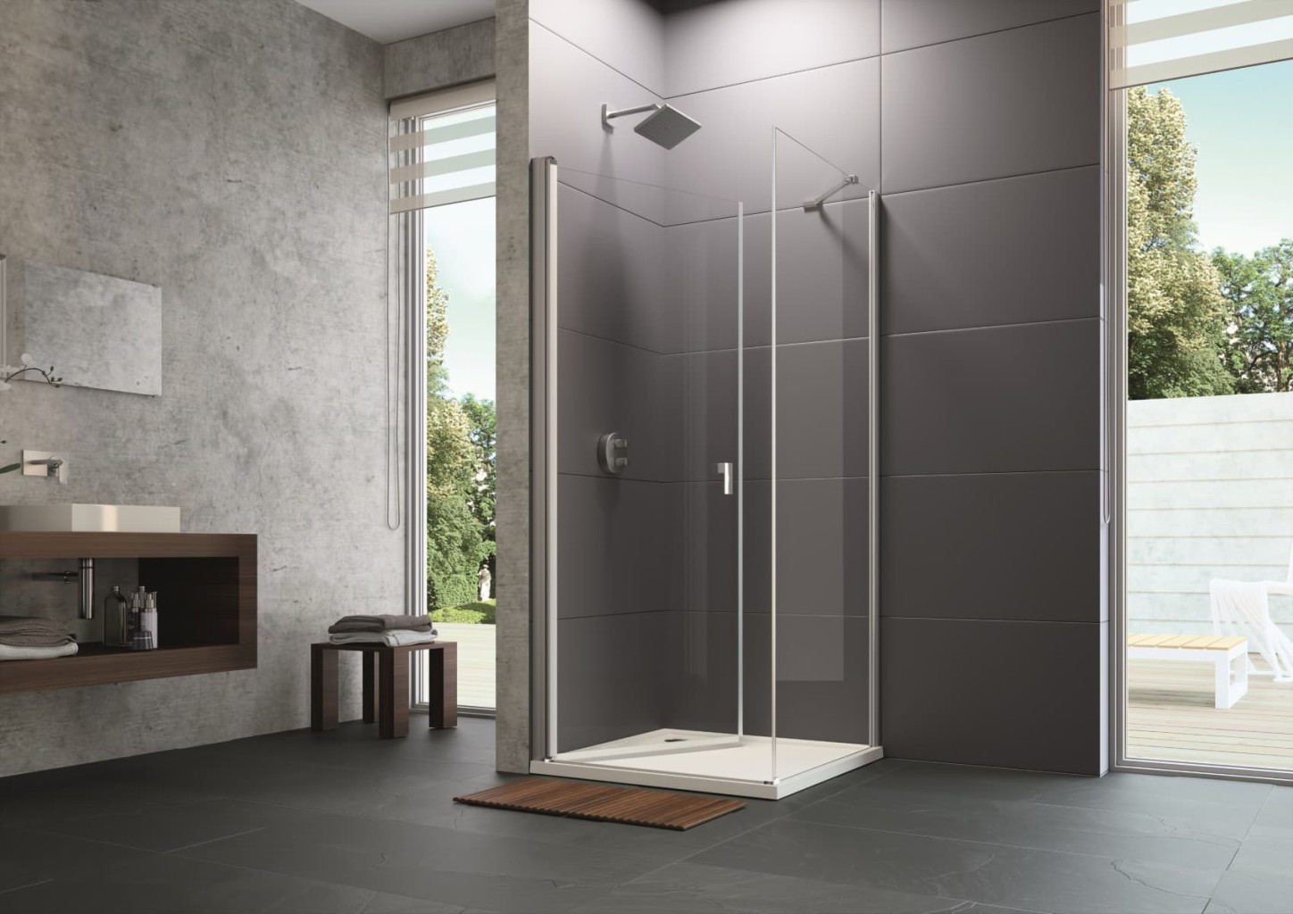 U křídlových dveří s boční stěnou přes roh pouze otevírání ven. S doplňkovým setem pro otevírání dovnitř/ven je možné i otevírání dovnitř.