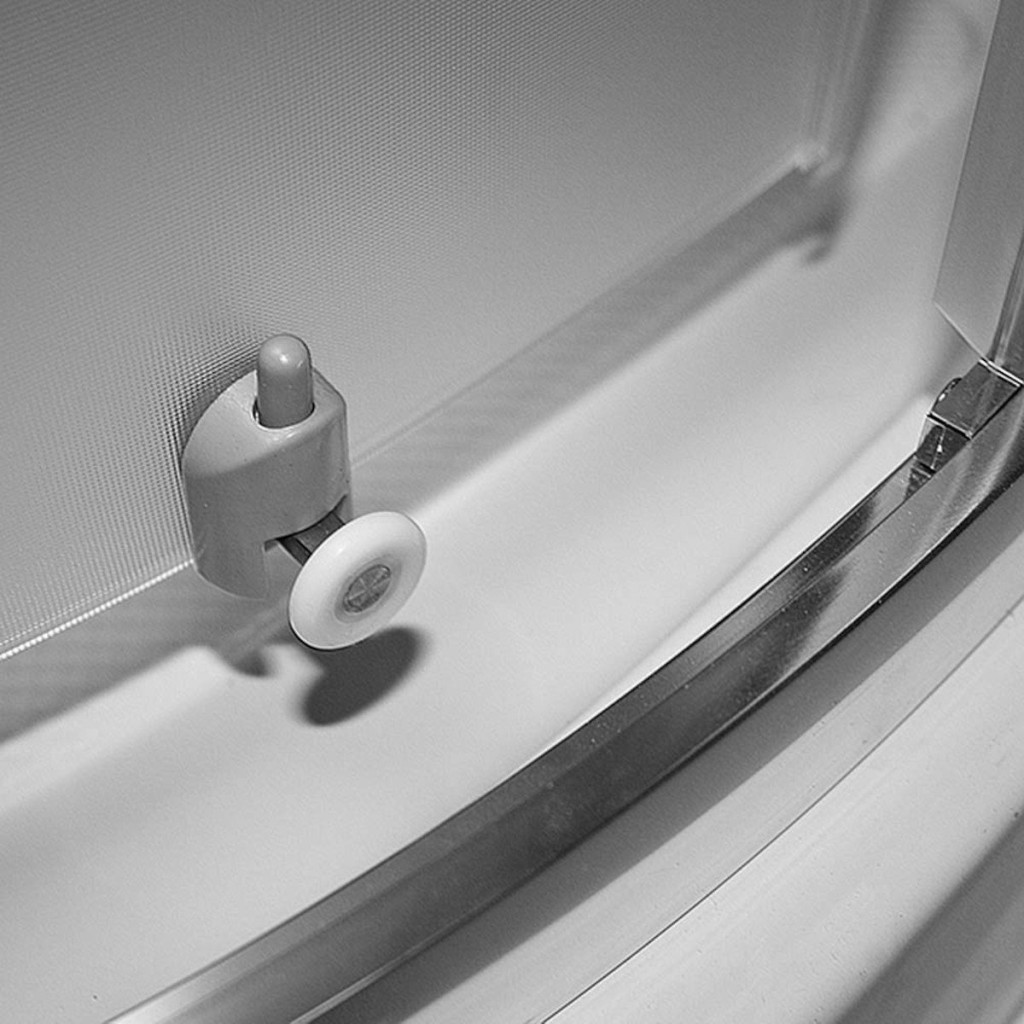 Roth sprchový kout HOUSTON NEO vybavil odklápěcími spodními pojezdy. Dveře lze odklopit velmi jednoduše. Jak můžete vidět na obrázku, na pojezdech se nachází šedá krytka s "čudlíkem". Čudlík ztlačíte směrem dolů a následně dveře už jen odklopíte od lišty. Je nutné oba dva čudlíky ztlačit najednou, abyste sklo mohli bez problému odklopit. Při odklopení spodní části dveře stále drží v horních pojezdech a tím ulehčují manipulaci a vy se tak nemusíte bát žádného nedopatření. Po vyčištění pojezdy jen nacvaknete zpět do lišty.