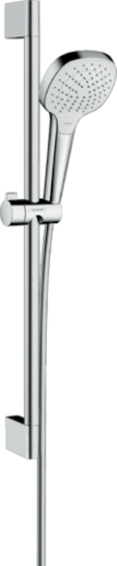 Sprchová sada Croma Select S Vario 9l Vás bude při sprchování hýčkat veškerým komfortem a díky moderní ruční sprše od hansgrohe bude ještě navíc šetřit vodou. Průtokové množství se i při vysokém tlaku vody automaticky omezí na max. 9 l/min. (EcoSmart). Plný komfort zajišťuje jednoduchý výběr tří typů proudu stisknutím tlačítka přímo na rukojeti (Select). Kromě ruční sprchy obsahuje tato kompletní sada také originální sprchovou tyč Unica a sprchovou hadici o délce 1,60 m. Jezdce na sprchové tyči (0,65 m) je možné plynule posouvat do různých výšek a lze také měnit jeho sklon v rozsahu 45°.