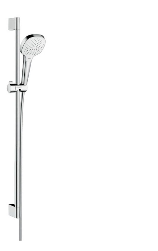 Sprchová sada Croma Select E Vario hýčká mnoha detaily, které zpříjemňují sprchování. Přepínání typů proudů je umístěno na snadno dosažitelném místě ve sprchové hlavici. Jednoduše na stisknutí tlačítka (Select). Kromě ruční sprchy obsahuje tato kompletní sada originální sprchovou tyč Unica a sprchovou hadici v délce 1,60 m. Jezdcem na sprchové tyči (0,90 m) lze plynule posouvat do různých výšek a lze měnit jeho sklon až o 45°.