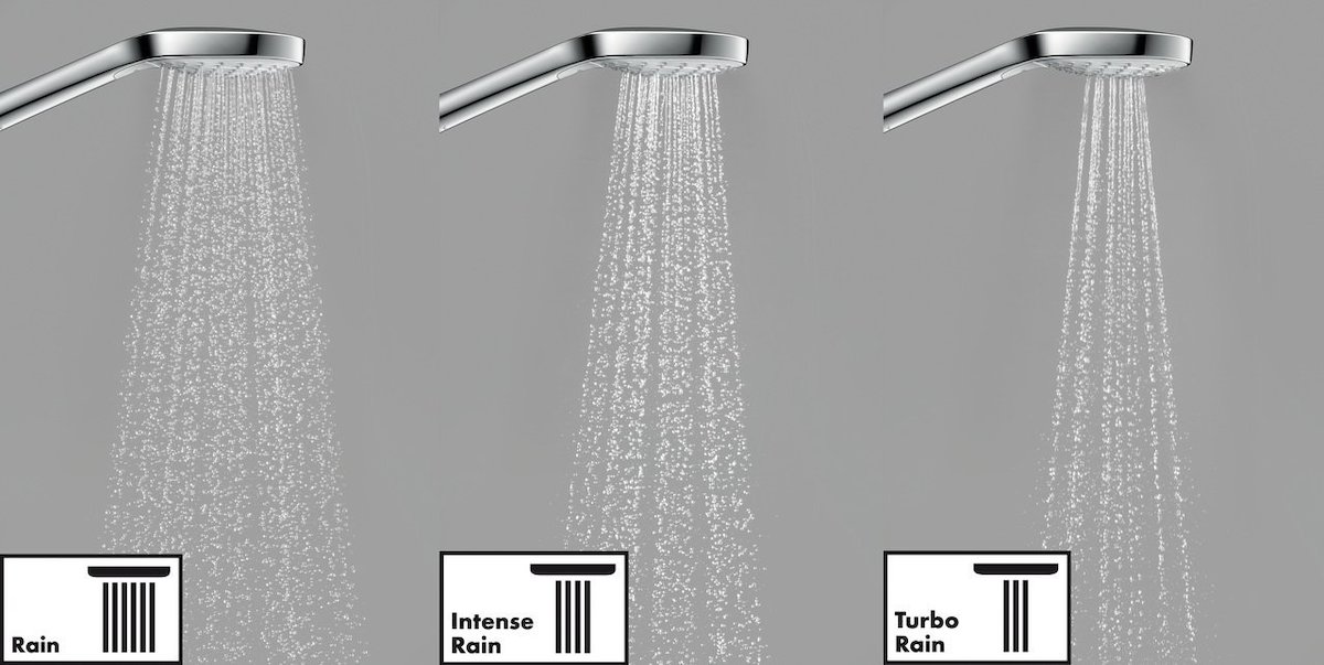 Mnohostranný požitek při sprchování nabízí 3 typy proudu (3jet): Rain, IntenseRain a TurboRain. Plný sprchový déšť nabízí typ proudu Rain, je ideální k důkladnému mytí vlasů. IntenseRain dopadá na tělo jako silný přívalový proud a jednoduše smývá stres všedního dne. Intenzivní svěžest přináší TurboRain – nejlépe ho vychutnáte s plným proudem vody.