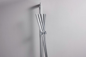 Trysky rozmístěné na velké ploše cylindrické sprchové hlavice zajišťují dokonalou distribuci vody. Tyčová ruční sprcha s nápadně minimalistickým designem upoutá pozornost při individuálních úpravách koupelny a nabízí se v různých povrchových úpravách. K dispozici je leštěný chrom, svěží bílá a výrazná černá.