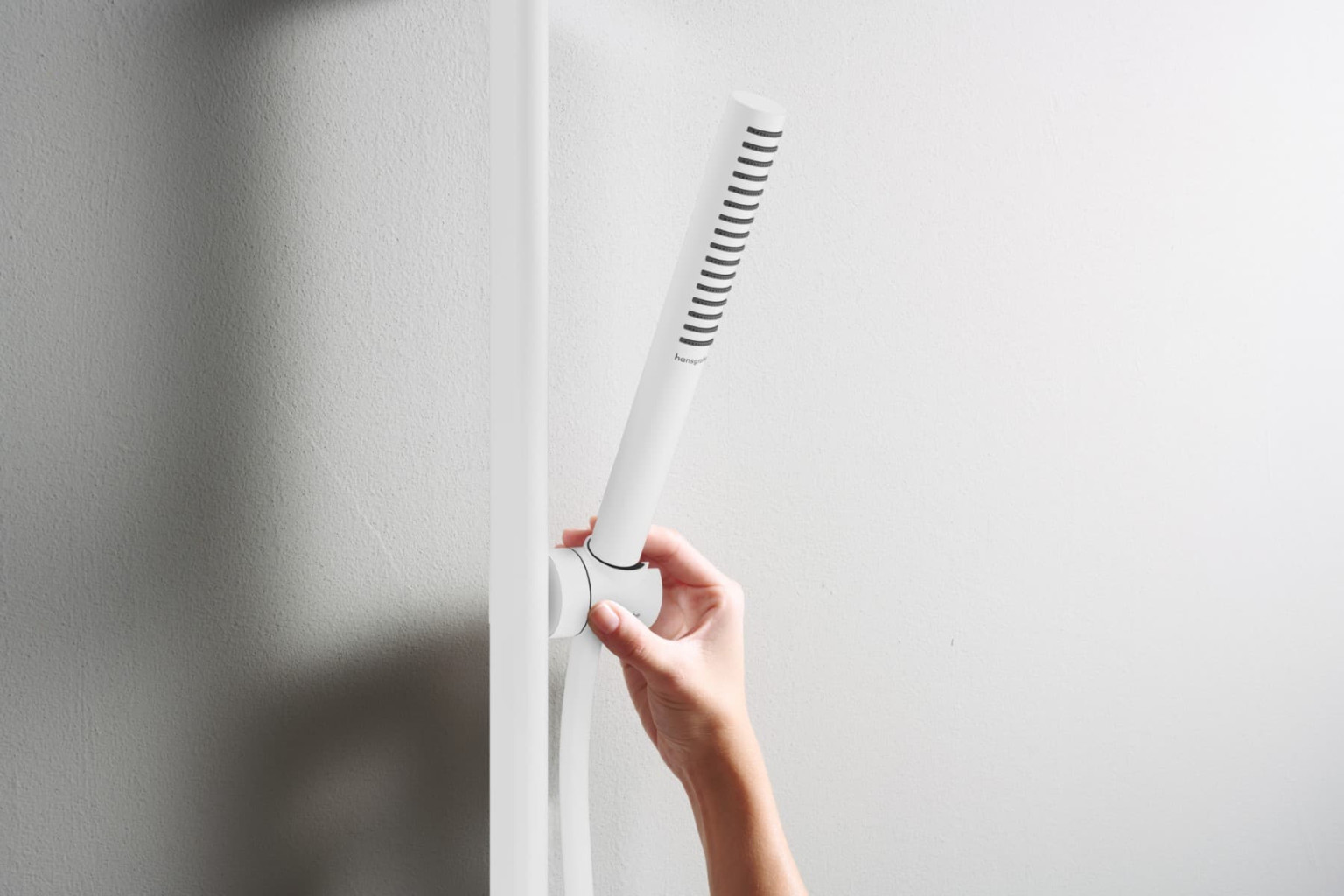 Trysky rozmístěné na ploše cylindrické sprchové hlavice zajišťují dokonalou distribuci vody. Tyčová ruční sprcha s nápadně minimalistickým designem upoutá pozornost a nabízí se v různých povrchových úpravách. K dispozici je leštěný chrom, svěží bílá a výrazná černá.