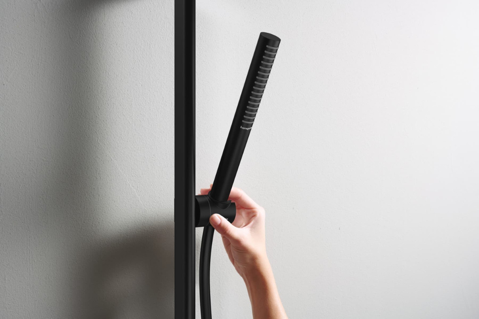Trysky rozmístěné na velké ploše cylindrické sprchové hlavice zajišťují dokonalou distribuci vody. Tyčová ruční sprcha s nápadně minimalistickým designem upoutá pozornost při individuálních úpravách koupelny a nabízí se v různých povrchových úpravách. K dispozici je leštěný chrom, svěží bílá a výrazná černá.