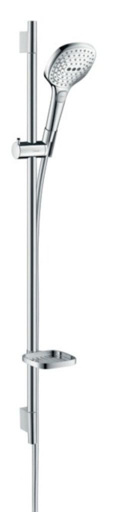 Se sprchovou sadouRaindance Select E 120přináší hansgrohe do koupelny potěšení ze sprchování. Mnoho dobře promyšlených detailů, jako je sprchová tyč Unica (0,90 m), sprchová hadice chráněná proti zlomení a praktická miska na mýdlo, od nynějška usnadňují sprchování. Ruční sprcha o velikosti 120 mm Vás bude hýčkat třemi navzájem sladěnými typy proudu. Lze je rychle a snadno přepínat pouhým stisknutím tlačítka (Select).