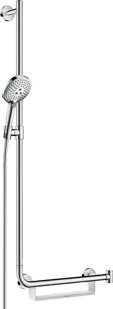 Sprchová sada Raindance Select S se skládá z dešťové sprchy hansgrohe, sprchové tyče o délce 1,10 m (vlevo), poličky a sprchové hadice o délce 1,60 m. Bezpečnost zajišťuje sprchová tyč, která byla testována institutem TÜV a lze ji navíc použít jako pevné madlo. Pevnost v tahu až 200 kg zaručuje bezpečné stání. Pochromovaná mosazná tyč o tloušťce 25 mm a solidní kovové držáky na stěnu jsou zárukou bezpečného držení. Sprchu lze upevnit i na madle, což usnadňuje sprchování dětí či osob s omezenou pohyblivostí. Praktická plastová polička zajistí pořádek a umožňuje snadné vyjmutí kvůli čištění.