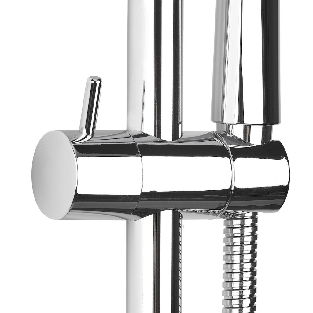 Výhodou sprchového setu e je nastavitelnost výšky držáku sprchy, proto sprchovou tyč ocení převážně ti, u nichž se v domácnosti v koupelně střídá vice osob, například i děti.