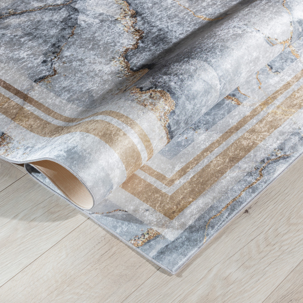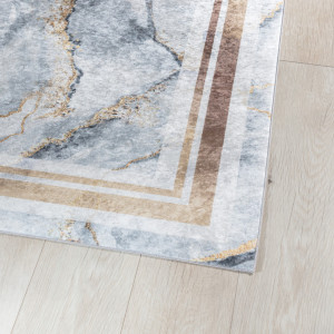 Dotaz na produktKoberec Squitta Grey Gold je glamour návrh. Povrch s potiskem vzoru stylizovaného jako drahý mramor je kombinován se zlatým rámem. Díky tomu je tento produkt senzační volbou pro interiéry zařízené s vkusem, kde se vkusný glamour setkává s elegancí. Polyesterový vlas a jutová spodní strana koberce zajišťují, že model příliš rychle neztrácí svou krásu, a chrání ho před poškozením, třepením a znečištěním.
