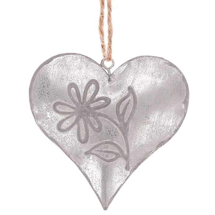 Dotaz na produktZávěsné srdce s jemným motivem květiny, vyrobené z kovu ve stříbrné barvě, je krásnou dekorací, která vnese do vašeho interiéru či zahrady romantický nádech. Srdce na provázku snadno ozdobí dveře, okno nebo jiný prostor, kterému chcete dodat kouzlo a eleganci.