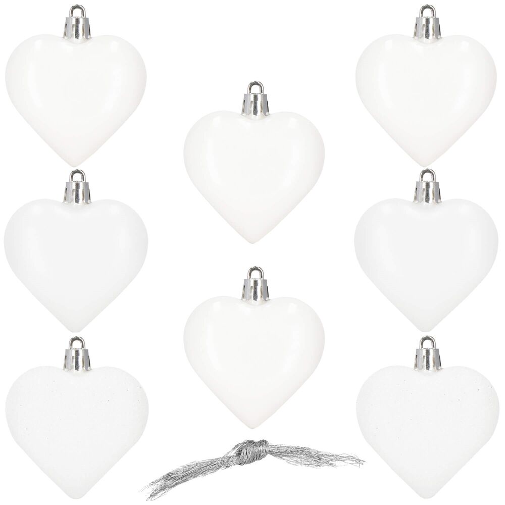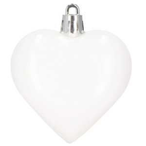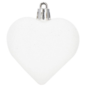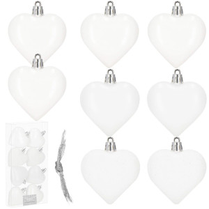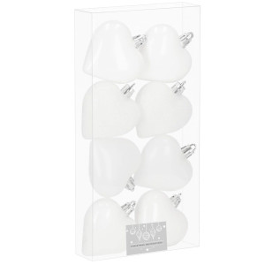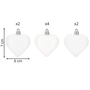Sada vánočních ozdob ve tvaru srdíček v bílém provedení dodá vaší výzdobě jemný a romantický vzhled. Ideální jako dekorace na vánoční stromeček, sváteční stůl nebo do oken. Vyrobeny z nerozbitného plastového materiálu, vhodné pro vnitřní i venkovní použití. Součástí balení jsou poutka pro zavěšení. Průměr 6 cm, celkem 8 kusů v sadě.