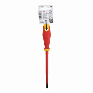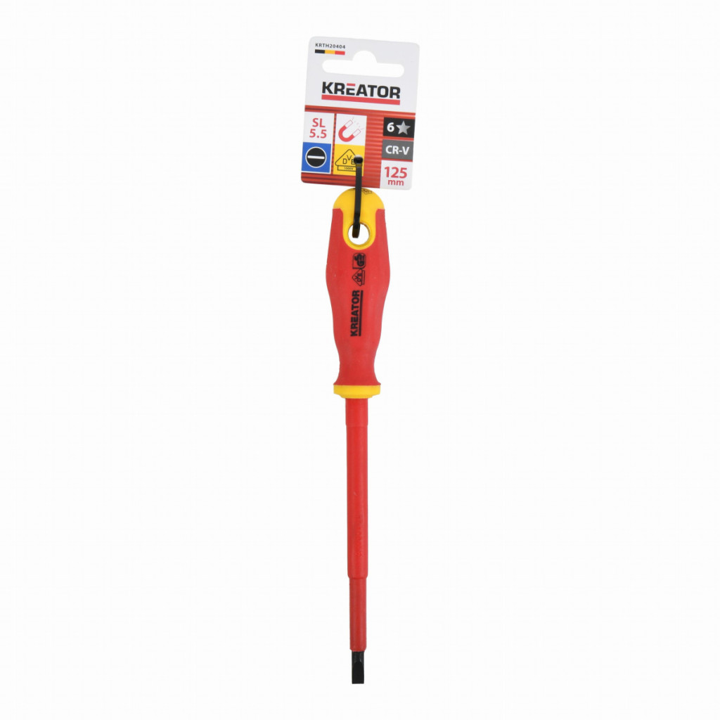 Dotaz na produktTento elektrikářský šroubovák KRTH20404 z naší řady Kreator má 125 mm dlouhou stopku a je vyroben z vysoce kvalitní oceli CR-V. Magnetický hrot SL5,5 urychluje proces šroubování. Šroubovák je ideální pro všechny druhy elektrikářských projektů. Měkká protiskluzová rukojeť poskytuje pevný úchop a rukojeť má integrované závěsné oko pro snadné skladování.