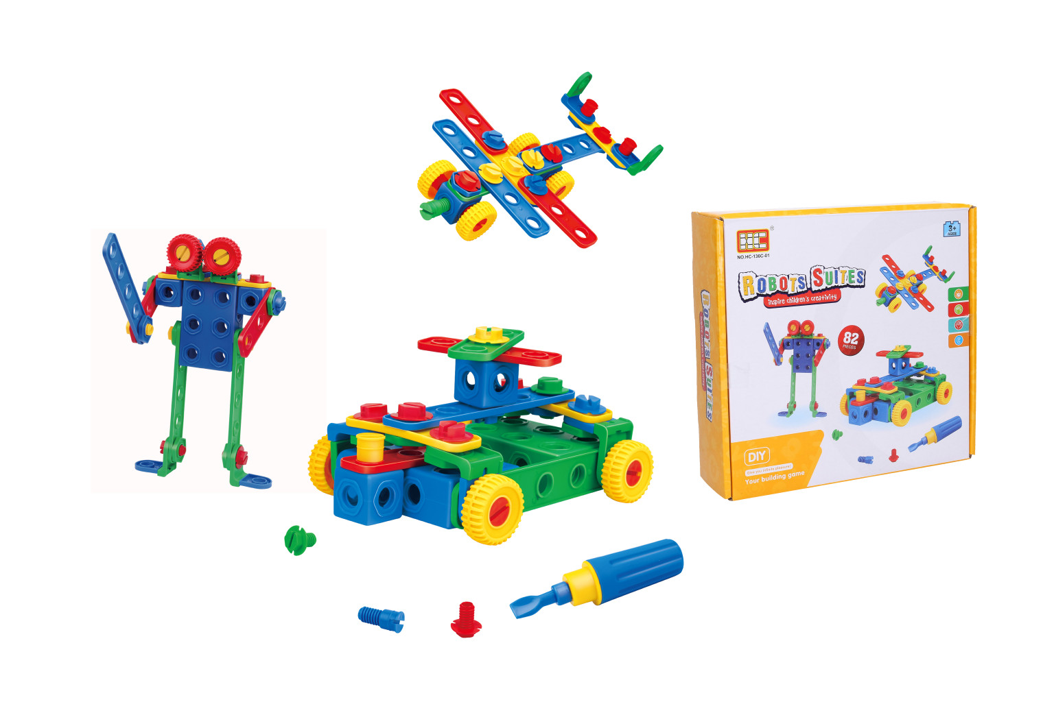 Dotaz na produktStavebnice šroubovací. Obsahuje 82 dílků, šroubovák, a obrázky výrobků pro inspiraci.