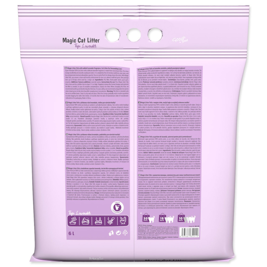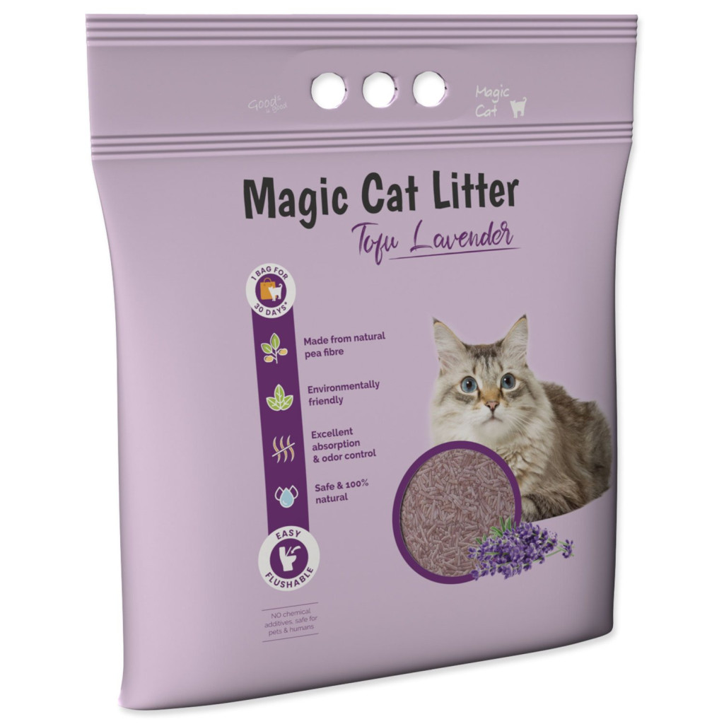 Je zcela bez chemických přísad, netoxické a s úžasnou schopností absorpce vlhkosti. Hrudky můžete snadno spláchnout do toalety. S Magic Litter Tofu zajistíte své kočce čisté a zdravé prostředí, ve kterém se bude cítit skvěle. Jedno balení vydrží při používání jednou kočkou až 30 dnů.