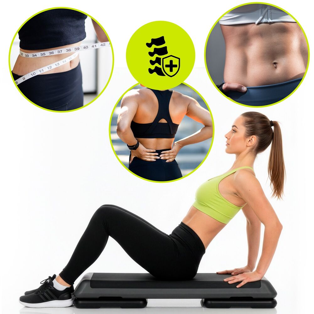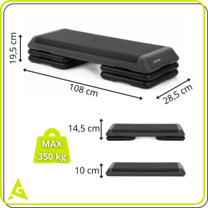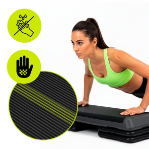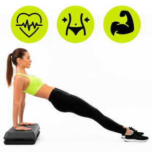 Aerobní step bedýnka pro efektivní kardio trénink a posílení dolní části těla. Velká plocha pro bezpečné cvičení. Nastavitelná výška ve 3 stupních 10, 14,5 a 19,5 cm. Protiskluzový povrch desky pro jistý krok. Protiskluzové nožičky pro stabilitu. Robustní konstrukce pro dlouhodobé používání doma i ve fitku.