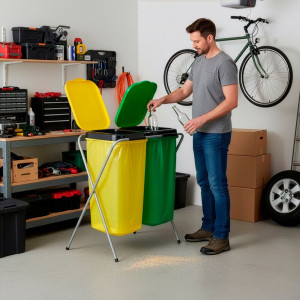 Dotaz na produktPraktický stojan umožňuje přehledné třídění odpadu do dvou samostatných pytlů. Barevné kryty usnadňují rozlišení jednotlivých druhů odpadu a vnitřní klopa spolehlivě drží pytle na místě. Stabilní, ale lehká kovová konstrukce je doplněna protiskluzovými krytkami nožiček. Vhodný do garáže, dílny, domácnosti i technických prostor.